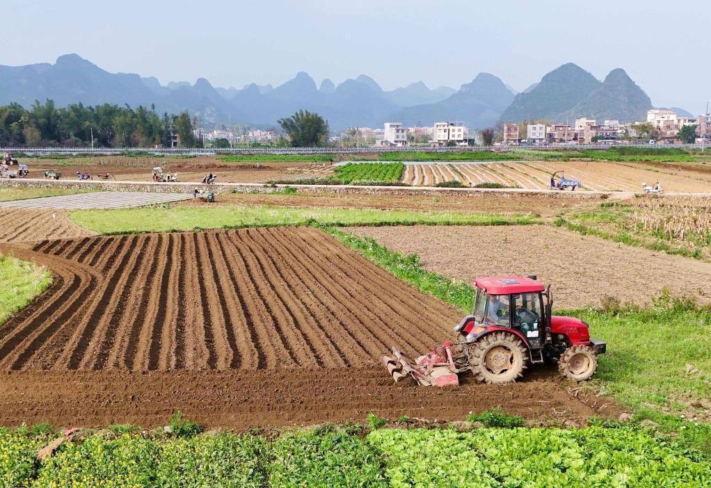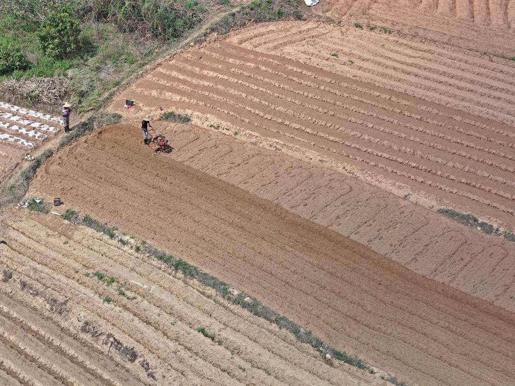 近日,广西来宾市忻城县城关镇都乐村农民驾驶农机在翻耕田地,准备种植玉米(无人机照片)。一年之计在于春,各地人们忙着翻耕土地、培育秧苗、检修农机、装运化肥,为春耕生产做准备。