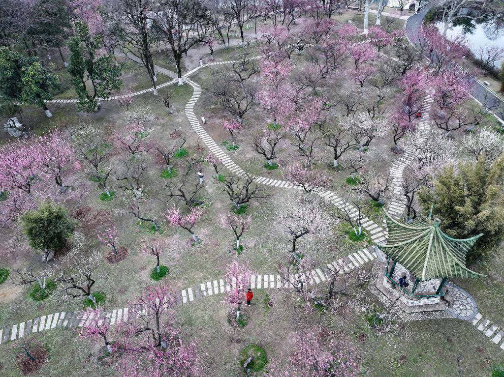 近日,游客在湖北省武汉市青山公园赏花游玩(无人机照片)。