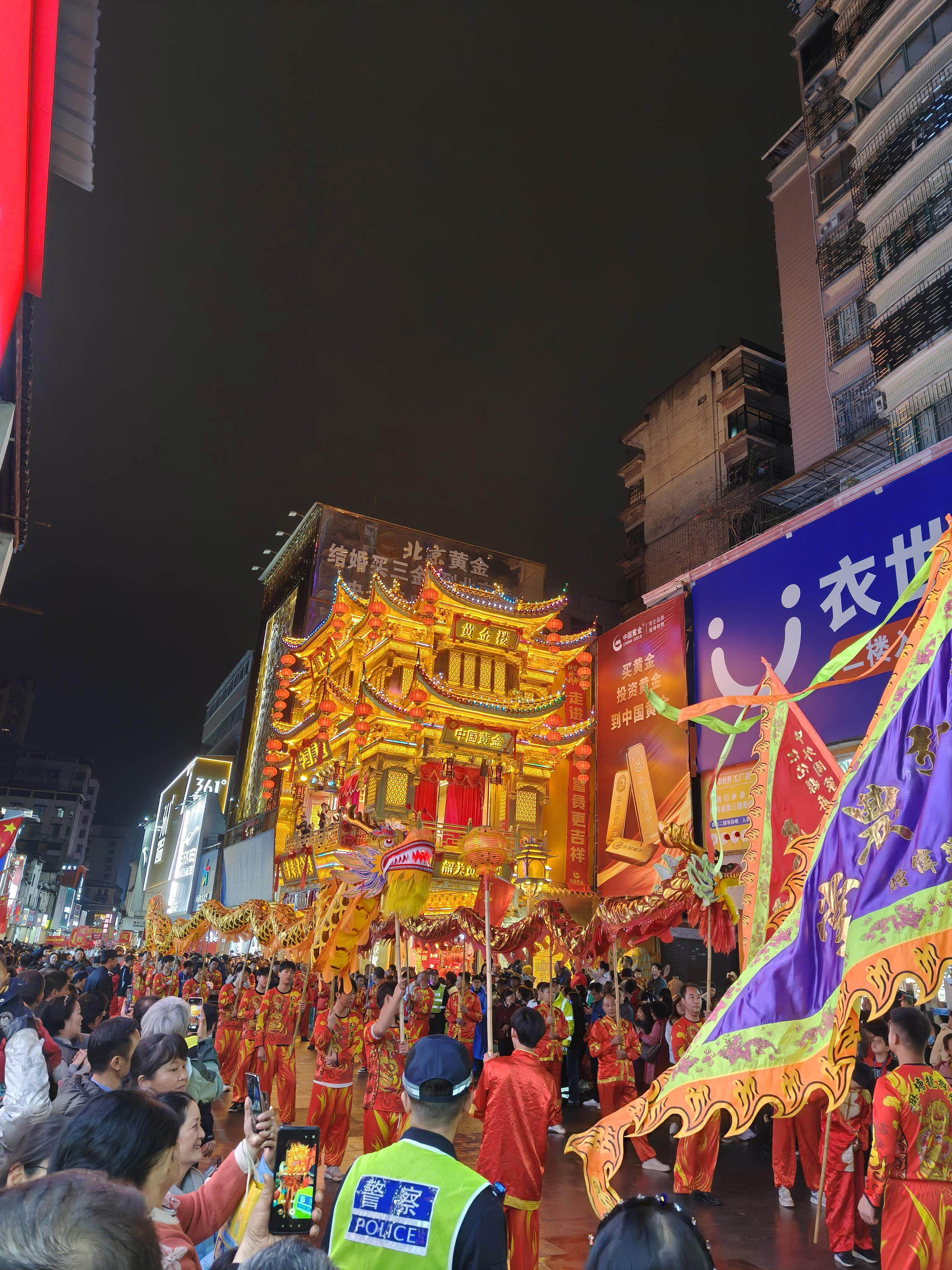 夜色之中,九十九节长龙蜿蜒翻腾,灯光映照下气势如虹,与马年“龙马精神”的美好寓意相互呼应,成为巡游队伍中最为壮观的场景之一。