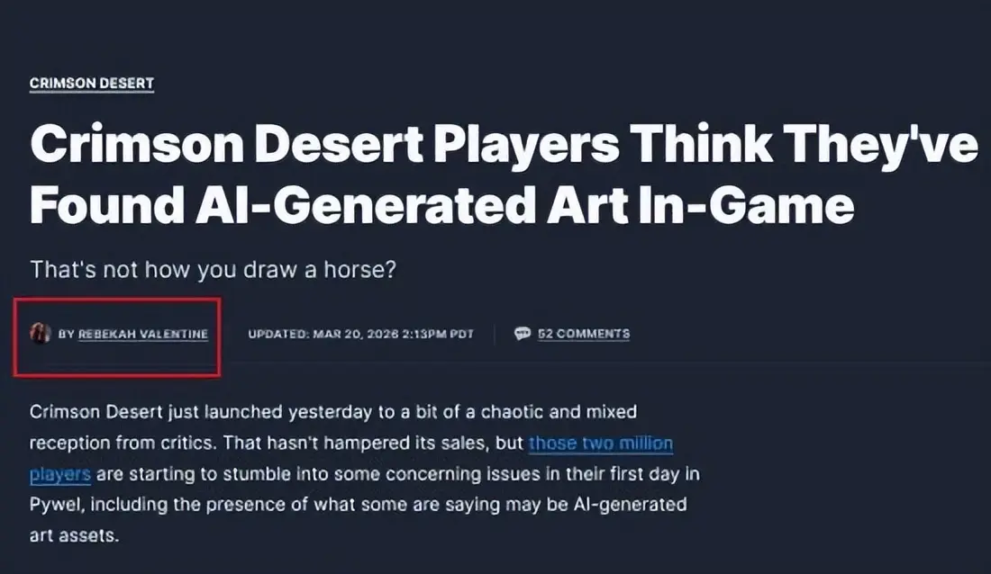 而现在,她又把矛头对准了韩国厂商 Pearl Abyss,原因是他们的新作《红色沙漠》被质疑使用了AI生成画作。