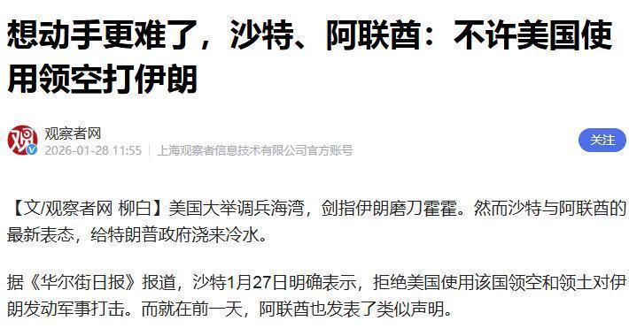 阿联酋和沙特在分别在26日27日发表声明,明确拒绝美军使用其领空、港口和基地对伊朗发动攻击。