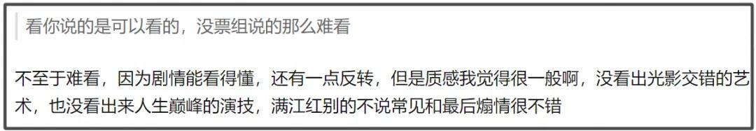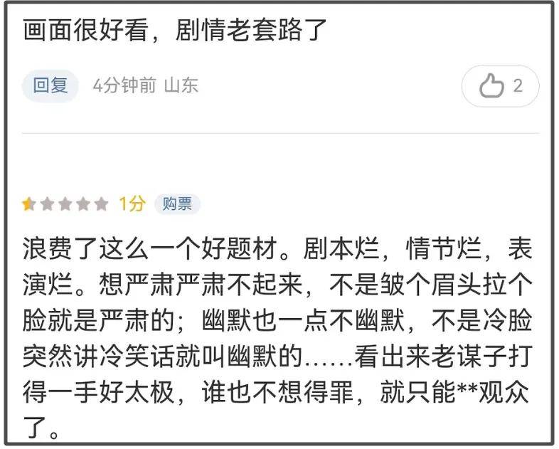 要说影片最大优势是张艺谋导演,但影片质感也被吐槽了,没看出光影的艺术,也没有演员贡献巅峰演技,看上去还不如《满江红》。