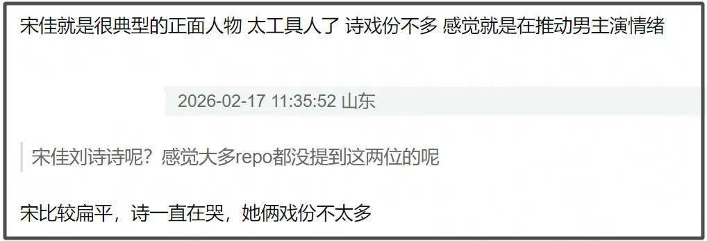 那么影后宋佳呢?疑似受角色限制,人物扁平,高光也不多,没有宋佳发挥的余地,像是推动剧情的工具人。