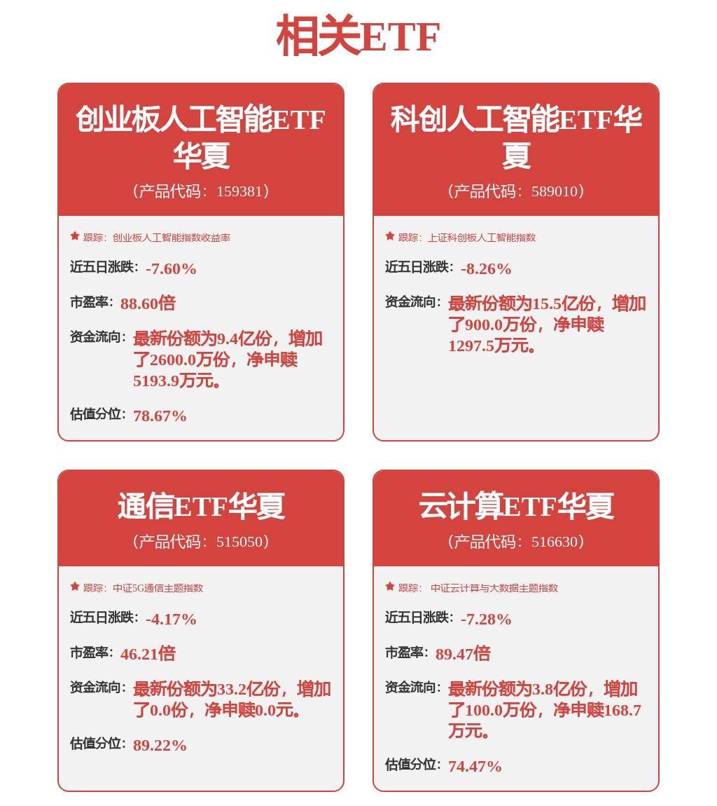 通信ETF华夏(515050)深度聚焦电子(芯片、PCB、消费电子)+通信(光模块、服务器、光纤光缆)算力硬件。前10大持仓股:新易盛、中际旭创、立讯精密、工业富联、兆易创新、天孚通信、东山精密、华工科技、中兴通讯、沪电股份。场外联接(A类:008086;C类:008087)